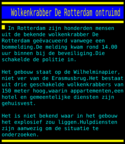 Web Door een bommelding in De Rotterdam op de Wilhelminakade in Rotterdam staan honderden mensen op straat. Na onderzoek van de politie een explosievenexperts. Ook werden de toegangswegen naar het vliegveld.